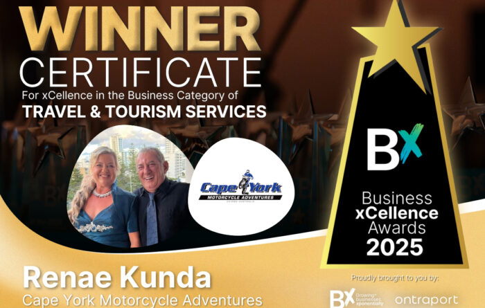 We’re beyond proud to announce that Cape York Motorcycle Adventures has been named the 2025 Winner in the Travel and Tourism Services category at the prestigious Business xCellence Awards by Bx Business Networking. This recognition honors businesses who are setting new standards of excellence, and we’re thrilled to be standing alongside so many incredible entrepreneurs and industry leaders. A Milestone in a Long Journey of Trailblazing This award is not just about one year of hard work, it’s the result of decades of pioneering in the tourism industry. From being the world’s first eco-certified motorcycle tour company to racking